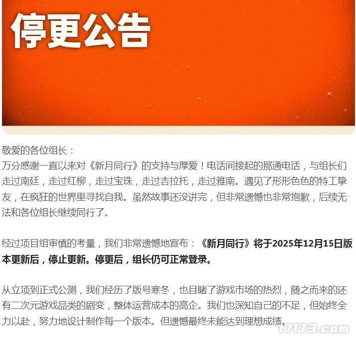 近日由烛薪工作室研发运营的《新月同行》宣布,游戏将于2025年12月15日版本更新后正式停止后续内容更新,游戏不会关服,玩家可以照常登录游戏,不过当天游戏关闭注册和下载。停运的原因官方表示,是因为二次元游戏竞争激烈,游戏整体运营成本过高,成绩不理想,因此决定停更。